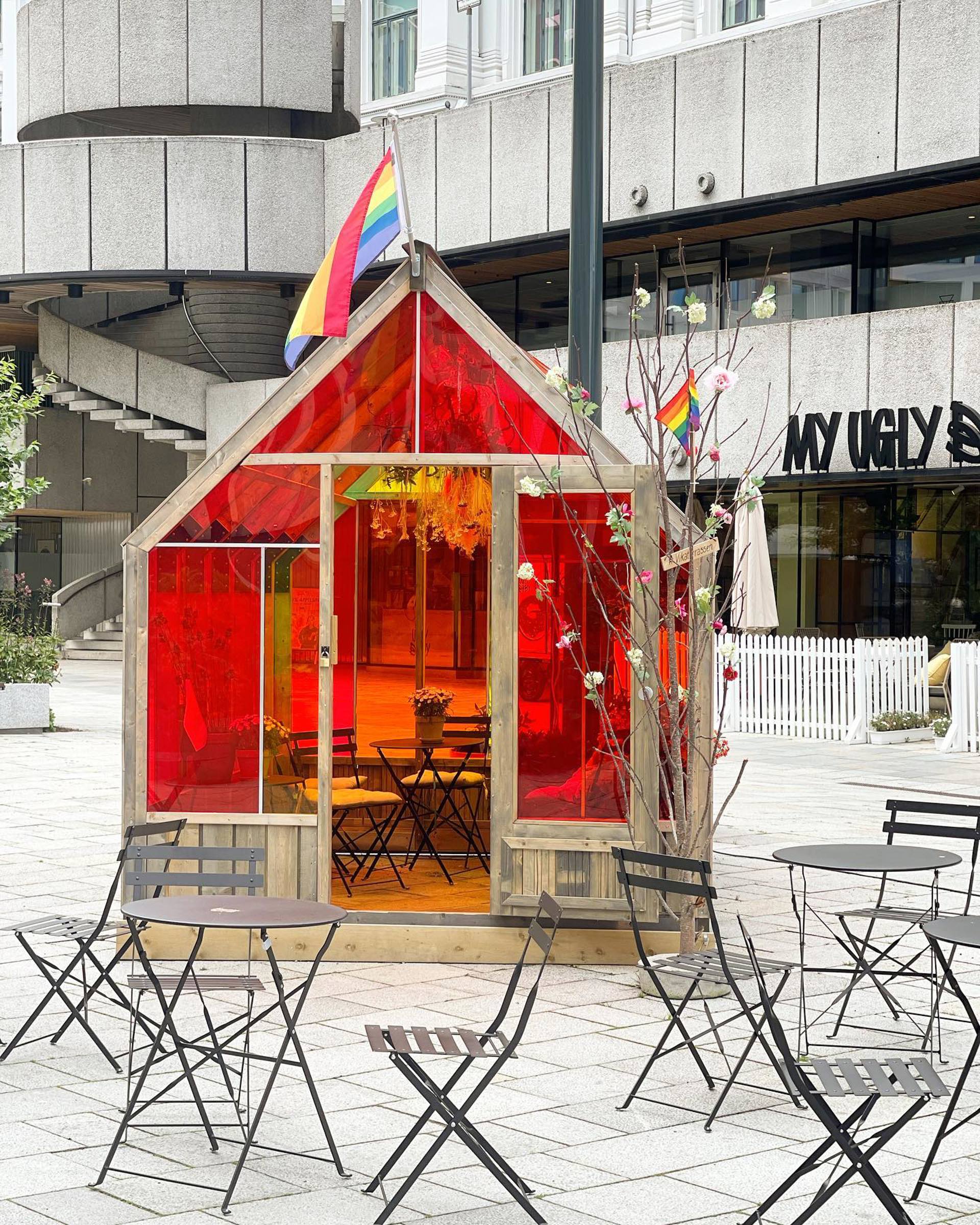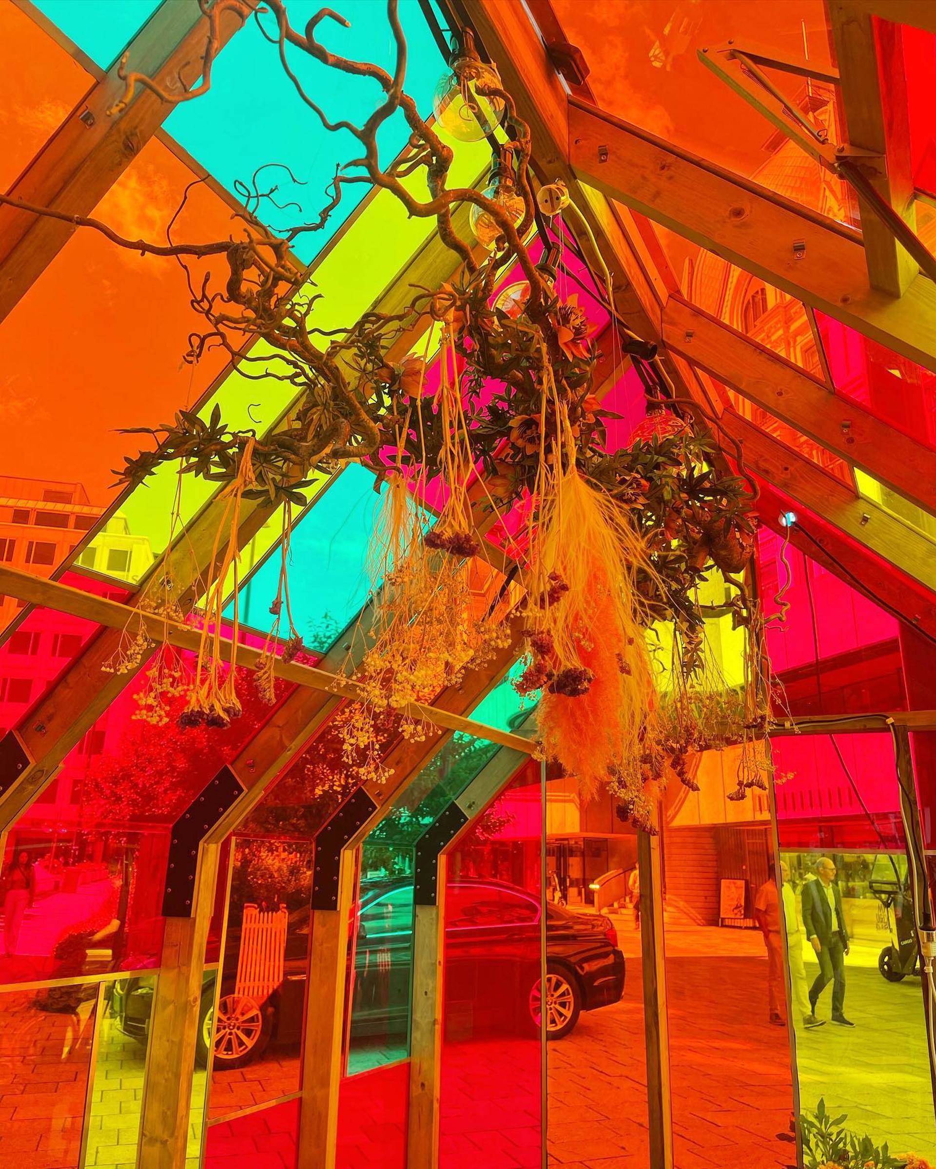 Plexon har levert fargede plexiglass plater til dette drivhuset eller oasen. Zenisk står bak ideen til denne glade og publikumsvennlige hvileplassen.