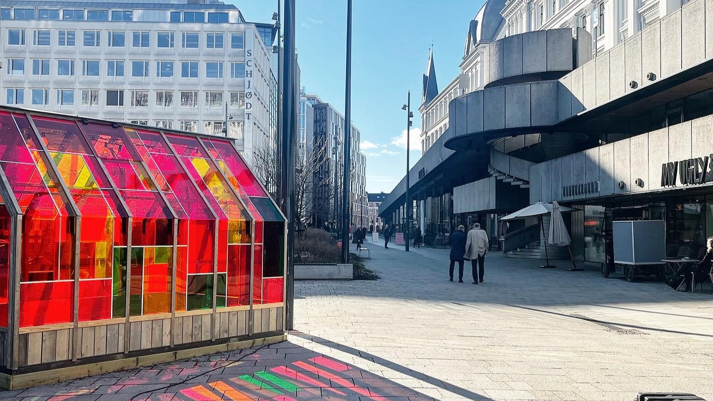 Vikaterrassen, et åpent og inviterende byrom i Oslo, med en rik historie og et spennende handels- og serveringstilbud. Se "drivhuset" med flotte farger, installert for en fargerik pust i bakken!